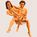 立った状態の男が、女の両脚をつかんで逆さづりにする。開いた女の脚を開かせ、それをまたいだ状態で上から挿入する。